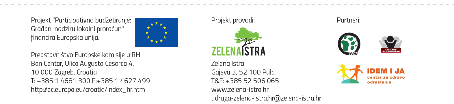 Glavni cilj ovog projekta jest omogućiti građanima Pule, Malog Lošinja i Karlovca informirano i aktivno sudjelovanje u donošenju gradskog proračuna te nadzoru nad njegovim izvršenjem. Zato ćemo u sklopu projekta “Participativno budžetiranje: građani nadziru lokalni proračun” pokrenuti tri inovativne internetske stranice za prikupljanje proračunskih prijedloga građana Pule, Karlovca i Malog Lošinja. Ove će stranice omogućiti argumentiranu raspravu o proračunskim prijedlozima na vrlo jednostavan način te će građani moći glasati i dijeliti putem društvenih mreža prijedloge koje podržavaju. Prijedlozi građana koji osvoje najveću podršku bit će definirani kao proračunski prioriteti te će ih partnerske udruge proslijediti na očitovanje lokalnim vlastima. Na ovaj način građani će dobiti povratne informacije o prioritetnim prijedlozima koji će biti uvršteni u prijedlog proračuna. Budući da konstruktivna participacija iziskuje aktivno, informirano i educirano građanstvo te kako bi prijedlozi građana bili što kvalitetniji, izradit ćemo i proračunske vodiče za građane te organizirati javne prezentacije gradskih proračuna, gdje će biti predstavljene mogućnosti za sudjelovanje građana u procesu donošenja proračuna.